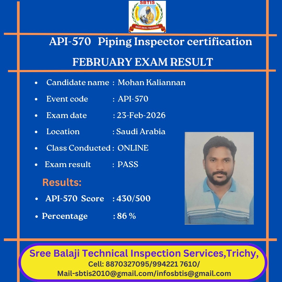 API 570 – Piping Inspector Recorded Video Class By Sree Balaji Technical Inspection Service (SBTIS), Trichy Mode: 100% Recorded Video Lectures Access: Watch Anytime, Anywhere – Self-Paced Learning Fee: ₹30, 000 API Exam Fee: USD 1070 (Payable directly to API) ________________________________________ What’s Included: Full API 570 Syllabus Coverage Detailed Explanation of: ASME B31.3, API 574, 577, 578, 571, ASME PCC-2 Code Navigation Techniques Practice Questions + Mock Tests Instructor Support via WhatsApp/Email Ideal for Working Professionals & International Students Contact: +91 88703 27095 SBTIS – Trichy’s Trusted Institute for API 570 Success