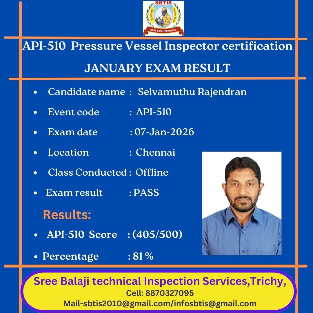 API 510 – Online Pressure Vessel Inspector Training By Sree Balaji Technical Inspection Service (SBTIS), Trichy Schedule: As per student request Mode: Live Online Classes via Google Meet Duration: 20 Days Preparatory Fee: ₹30, 000 API Exam Fee: USD $1070 (to be paid directly to API) Course Highlights: • Full coverage of API 510 Body of Knowledge • ASME Sections VIII, IX, and V are explained in detail • API-571, API-577, API-578, API-572, ASME PCC-2 • Daily live sessions, Q& A support & recorded lectures • Practice tests, code navigation & renewal assistance Flexible timing for working professionals across India & abroad Contact: +91 88703 27095 Organised by: Sree Balaji Tower, Trichy – Tamil Nadu Achieve Certification Success – Train Online with SBTIS!