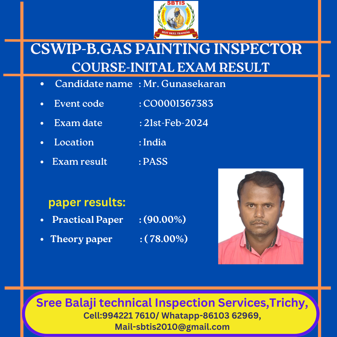 painting inspector grade 2 course near me trichy 🌟 SREE BALAJI TECHNICAL INSPECTION SERVICE (SBTIS) 🌟 🎨 BGAS GRADE-2 – PAINTING INSPECTOR CERTIFICATION TRAINING 🎨 🏆 Trusted by Professionals | 100% Pass Support | Best in Trichy 🏆 📌 Become a Certified BGAS Painting Inspector (Grade-2) and take your coating inspection career to the next level! Join SBTIS, the most recommended training institute for BGAS certification, with a strong track record of success and experienced faculty. ✅ Upcoming Batch Details: 📆 Batch Start Date: 02nd May 2025 📍 Training Mode: Classroom & Online (Google Meet) Available 📚 Course Duration: 15 Days 🕘 Class Timings: Flexible for working professionals 💰 Course Fee: ✔️ Preparatory Training Fee: ₹25, 000/- ✔️ TWI Exam Fee: Separate (Payable directly to TWI during registration) 🔍 What You’ll Learn: ✅ Surface preparation standards ✅ Coating types, application methods, and mixing ✅ Inspection tools, environmental controls & calibration ✅ Identification of coating defects & visual acceptance standards ✅ Practice for BGAS exam (Paper 1 – Theory & Paper 2 – Practical) ✅ Mock tests & real-time Q& A with expert instructors 🎯 Who Should Attend? ✔️ Coating/Painting Inspectors & Supervisors ✔️ QA/QC Professionals in Oil & Gas, Petrochemical, Infrastructure sectors ✔️ Engineers and freshers seeking a career in coating inspection ✔️ Anyone preparing for BGAS Grade-2 Certification (TWI) 🏢 Organized by: Sree Balaji Technical Inspection Service (SBTIS) 🏅 Best Institute in Trichy for BGAS, API, CSWIP & NDT Training