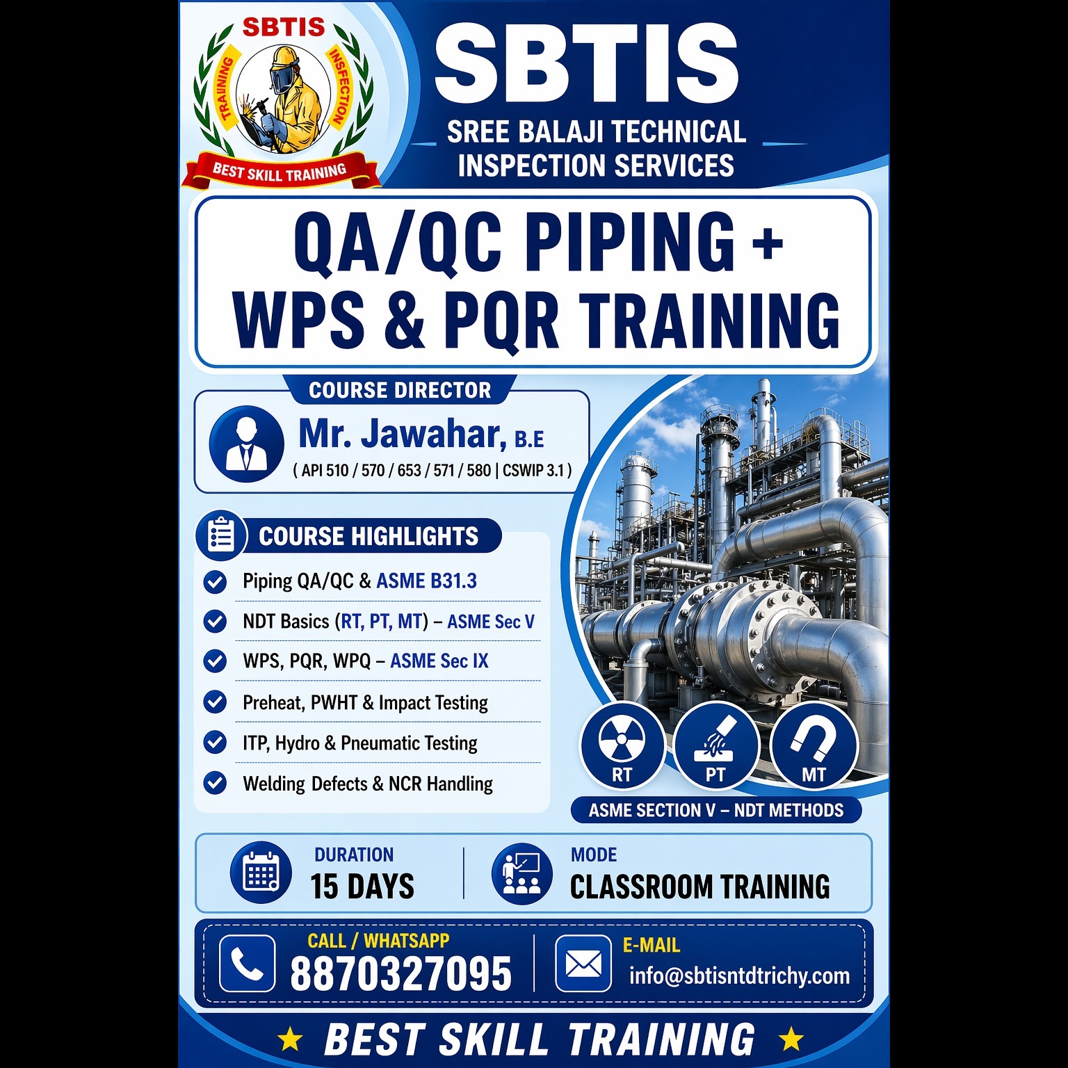 QA/QC Piping + WPS & PQR Training By Sree Balaji Technical Inspection Service (SBTIS), Trichy Course Duration: 15 Days Total Fee: ₹8, 000 Mode: Classroom & Online (Google Meet) ________________________________________ Course Content Overview Piping Inspection & QA/QC Topics • Introduction to Piping Systems • Piping Codes & Standards (ASME B31.3) • Isometric Drawings & P& ID Interpretation • Pipe Materials, Fittings, Flanges & Joints • PWHT & Preheating Requirements (ASME B31.3) • Impact Testing & Weld Acceptance Criteria ASME Section V – NDE Essentials • Article 1: General Requirements • Article 2: Radiographic Testing (RT) • Article 6: Liquid Penetrant Testing (PT) • Article 7: Magnetic Particle Testing (MT) ASME Section IX – Welding Procedures • WPS & PQR Review and Preparation • Welder Qualification (WPQ) • Essential, Nonessential, and Supplementary Variables • Welding Process Qualifications (SMAW, GTAW, GMAW, etc.) Testing, Inspection & Documentation • Inspection Test Plan (ITP) – Prep, Review, Approval • Hydrostatic & Pneumatic Testing Procedures • NDT Techniques Overview • Welding Defects – Causes, Identification & Remedies • NCR Handling – Root Cause, Disposition, Closure ________________________________________ Contact: +91 88703 27095 Location: Sree Balaji Tower, Trichy – Tamil Nadu Join SBTIS – Your Trusted Partner for QA/QC & Welding Qualification Excellence!