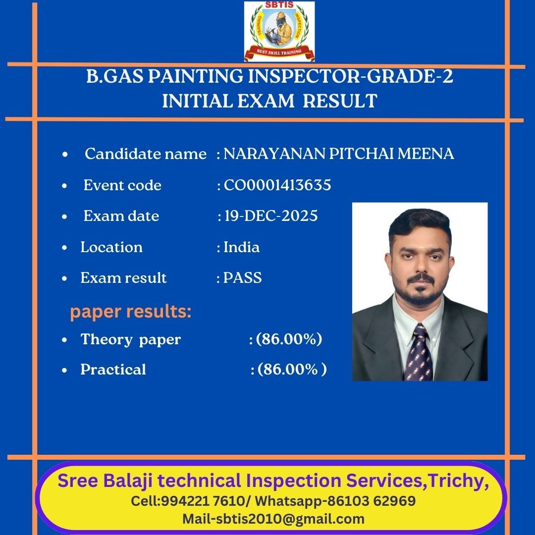 BGAS Grade 2 – Renewal Support & Preparatory Class By Sree Balaji Technical Inspection Service (SBTIS), Trichy Schedule: As per the candidate's request Duration: 5–7 Days (Flexible based on need) Renewal Support Fee: Contact for details TWI Exam Fee: Payable separately as per TWI guidelines Includes: • Refresher training on the BGAS syllabus • Updated visual standards & documentation review • Renewal documentation assistance • Practice sessions for theory & practical • Classroom & online support available Call/WhatsApp: +91 88703 27095, Location: Sree Balaji Tower, Trichy – Tamil Nadu